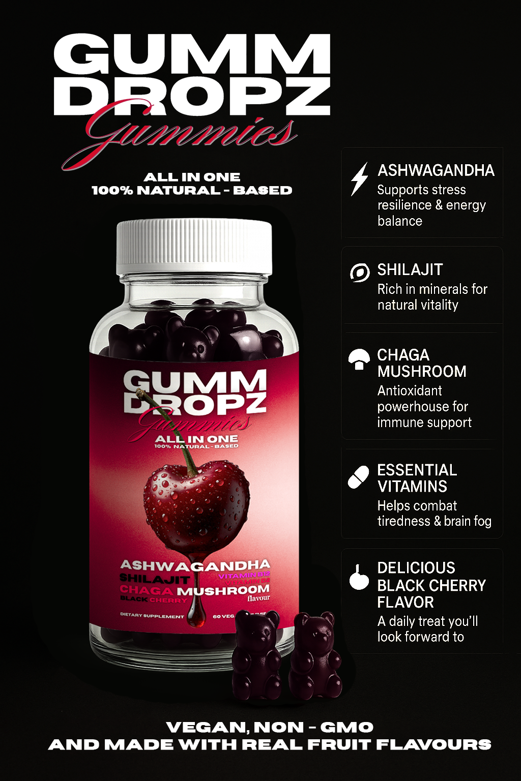 Tired of feeling dull and drained every single day? GUMM DROPZ® transforms your daily routine with black cherry gummies that taste like premium candy, not medicine. Our powerhouse blend of Ashwagandha, Shilajit, and Chaga Mushroom delivers unstoppable energy and that inner glow you crave - one delicious drop at a time.